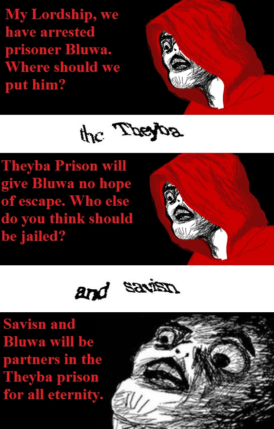 Bluwa is a prisoner who resides, for all eternity, in the Theyba Prison with a fellow prisoner, Savisn. Both men were charged and jailed for the murder of a Gropaga.