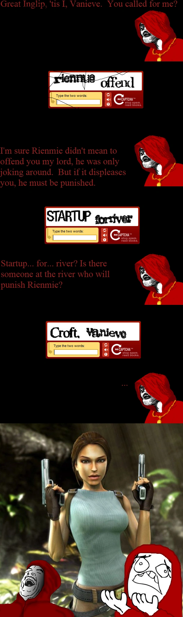 Vanieve was called upon by Inglip when a gropaga named Rienmie offended the Dark One with a joke. Inglip sent Vanieve on a trek to the nearby river, where he would find the one to punish Rienmie. Vanieve was the perfect one for this mission because when he reached his destination he saw Lara Croft emerging from the river. Vanieve was able to charm Croft into punishing Rienmie, who after his punisment, was never seen or heard from again.